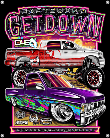 Eastbound Getdown 2026 Full Color Daytime Artwork Banner featuring: 2026 EBGD Nighttime Artwork Show Shirt by Graphic Disorder!! Featuring Robert Warring AKA Dirty Rob's 2008 Dodge Ram 2500 Mega Cab & Matthew Diaz's 1995 Nissan Hardbody pick up. This is a pre-sale starting October 4th running through October 23rd. PICKUPATEBGD26 for free shipping if picking up at EBGD in Jan. 2026 or pay shipping to have order shipped to your address when orders are received sometime in December 2025 Banner Size is: 24in. Wide X 36in. Long