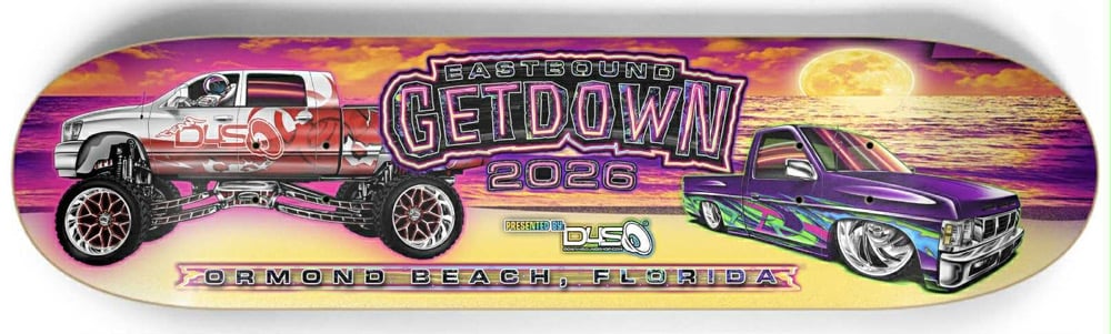 Eastbound Getdown 2026 Nightime Artwork Skatedeck 32X8.5 featuring: Robert Warrig AKA Dirty Rob's 2008 Dodge Ram 2500 Mega Cab & Matthew Diaz's 1995 Nissan Hardbody pickup. Artwork done by Graphic Disorder and Skatedecks done by: Naked City Pins. This is a pre-sale starting October 13th running through November 15th . PICK UP ONLY up at EBGD in Jan. 2026
